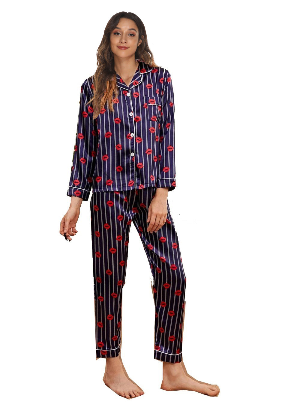 ارتدي راحتك في مجموعة Pajama للسيدات مع تصاميم نباتية تتميز بقميص طويل الأكمام مع أزرار بالإضافة إلى زوج من السراويل الحريرية المطابقة.