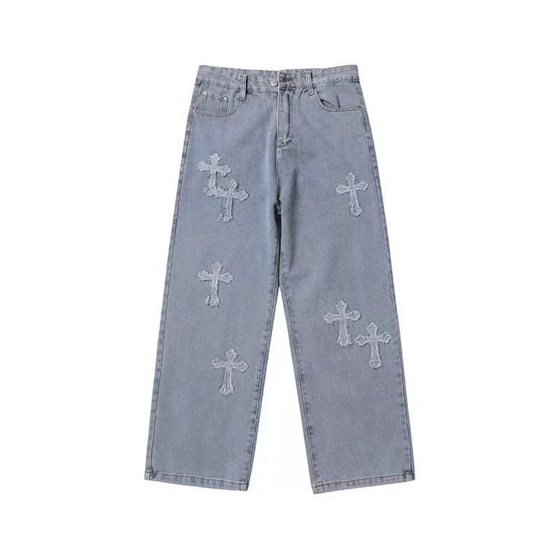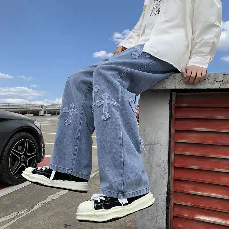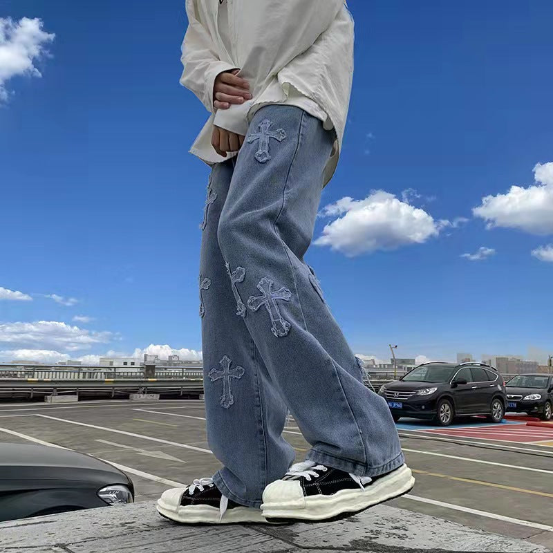 Men’s Baggy Blue Denim Jeans with Cross Details