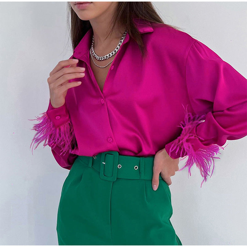 Erhöhen Sie den Look Ihrer Business-Casual-Kleidung mit der langärmligen Damenbluse mit V-Ausschnitt und Knöpfen und Federn, die feine Federn entlang der Handgelenke aufweist. Wählen Sie aus einer von vier Farben.