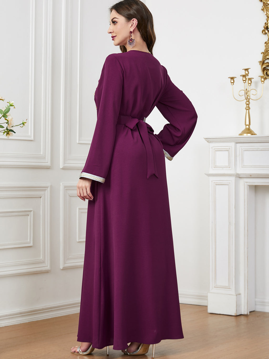 Make a memorable fashion statement with the Women's Long Sleeve Maxi Dress featuring ornate botanical details along the front. It comes in purple, red, blue and green.
