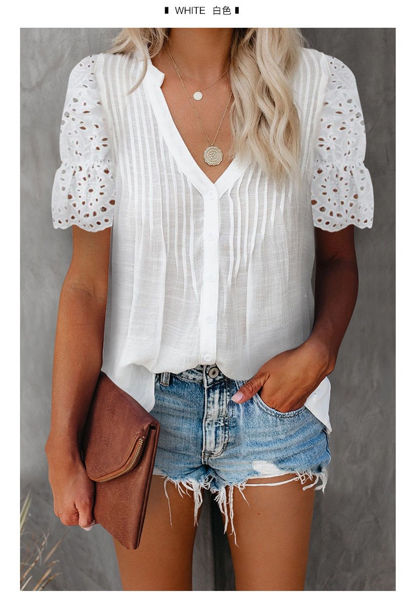 Una combinación de material ligero semitransparente y mangas de encaje hace que esta blusa casual de mujer semitransparente de manga corta de encaje sea una opción elegante y linda. Viene en varios colores para adaptarse a todos los gustos.