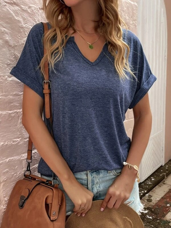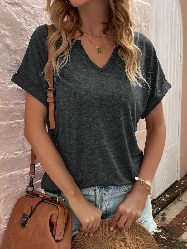 Manténgalo informal en sus salidas diurnas con esta camiseta de mujer de ajuste holgado de manga corta con cuello en V. Es cómodo y transpirable con su diseño holgado y viene en seis opciones de color.