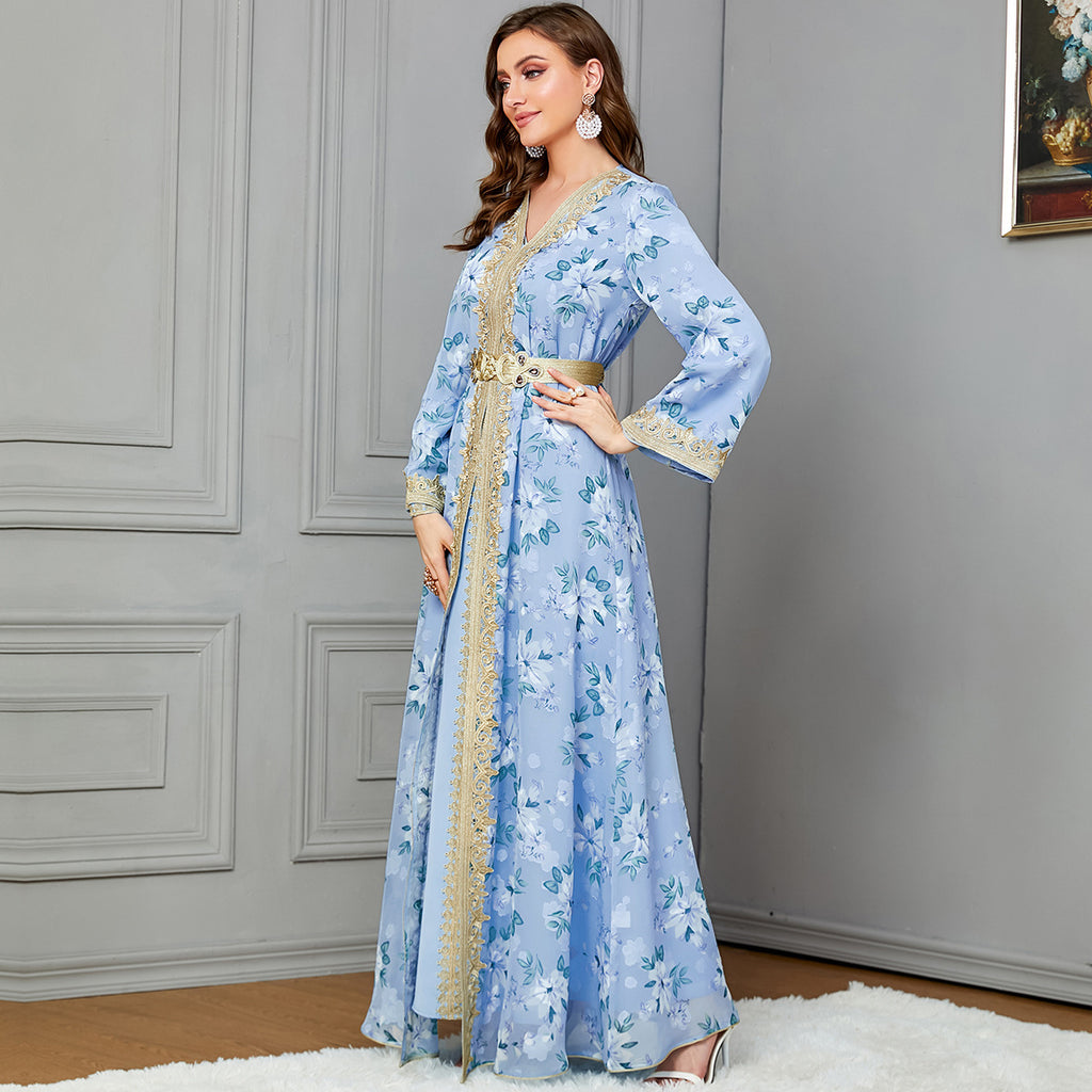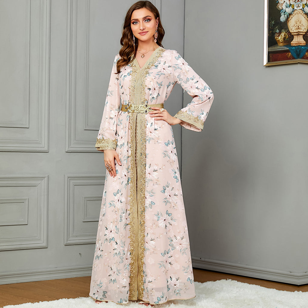 Women's Pastel Floral Print Maxi Dress with Gold Trim