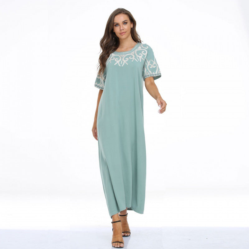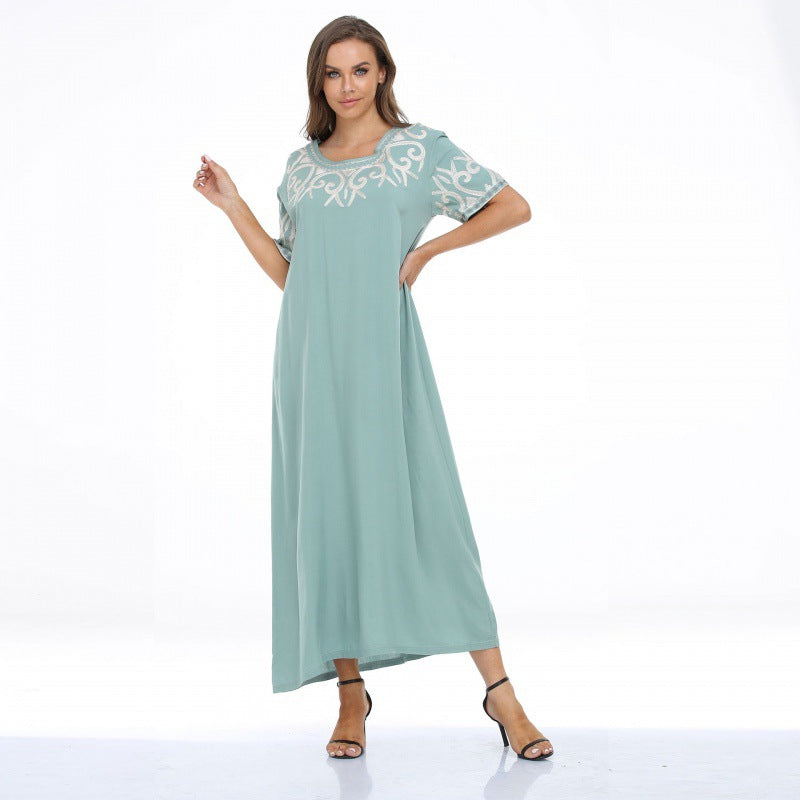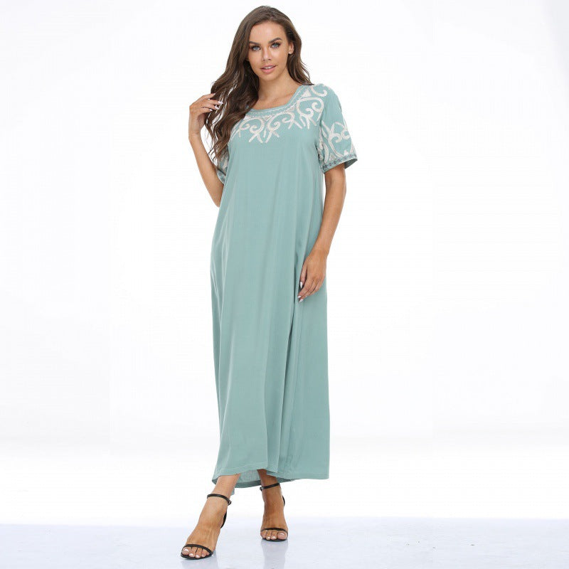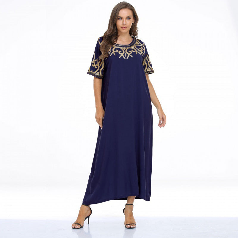 Terlihat chic musim gugur atau musim semi ini dalam gaun maxi wanita dengan lengan pendek dan detail emas yang menampilkan kain o-neck dan longgar yang hadir dalam dua warna biru.