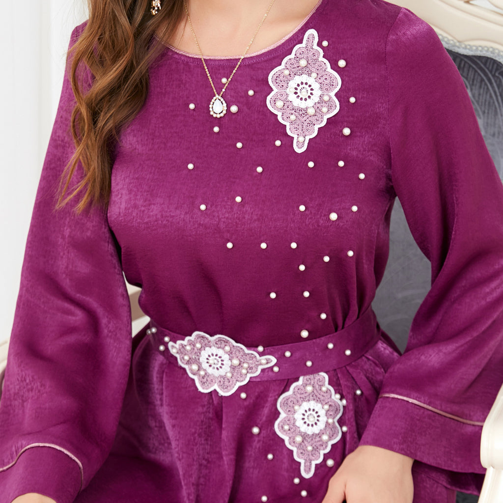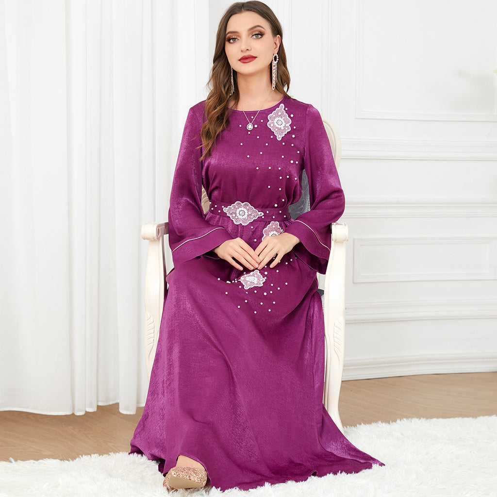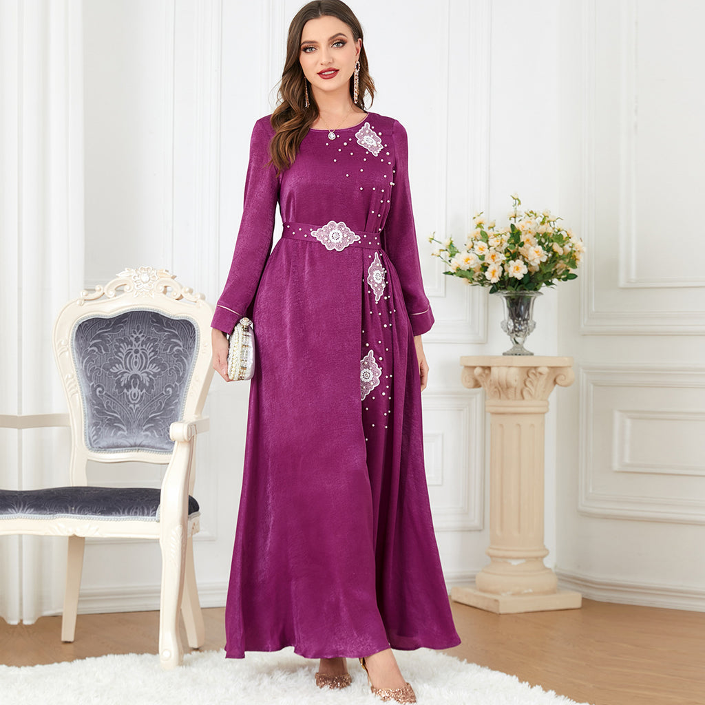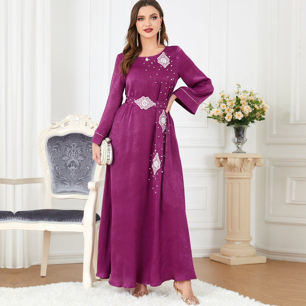 The vibrant magenta hue of the Women's Long Sleeve Silky Maxi Dress adds rich color and personality to your nighttime wardrobe. It features small white and pink decorations for detail.
