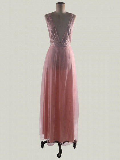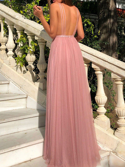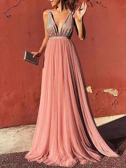 Elegante e sofisticato, l'abito rosa in stile principessa femminile con scollo a V e maxi orlo è abbastanza versatile per qualsiasi occasione formale. Presenta un collo a V ripido con spalle con il cinturino e una gonna a maxi fluente.