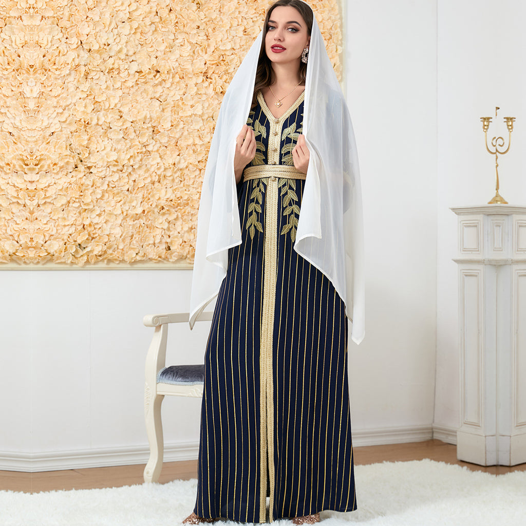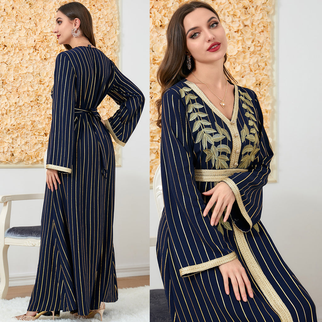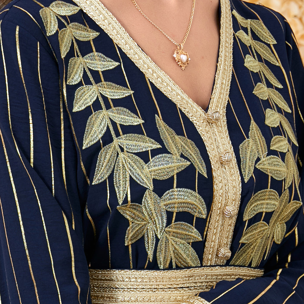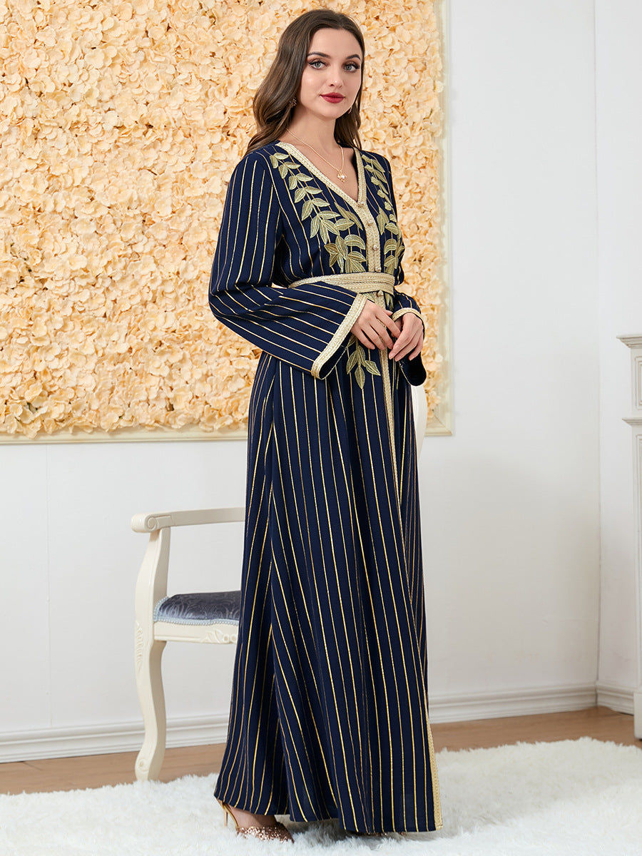 Sophisticated and chic, the Women's Long Sleeve Blue Maxi Dress with Vertical Stripes features a simple golden leaf decoration along the bodice.