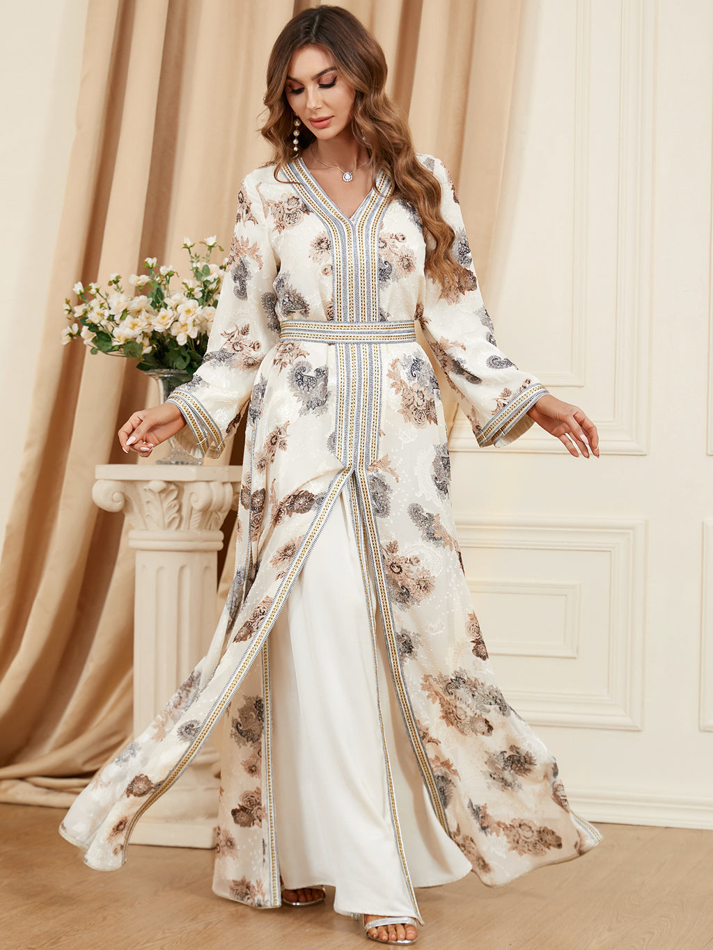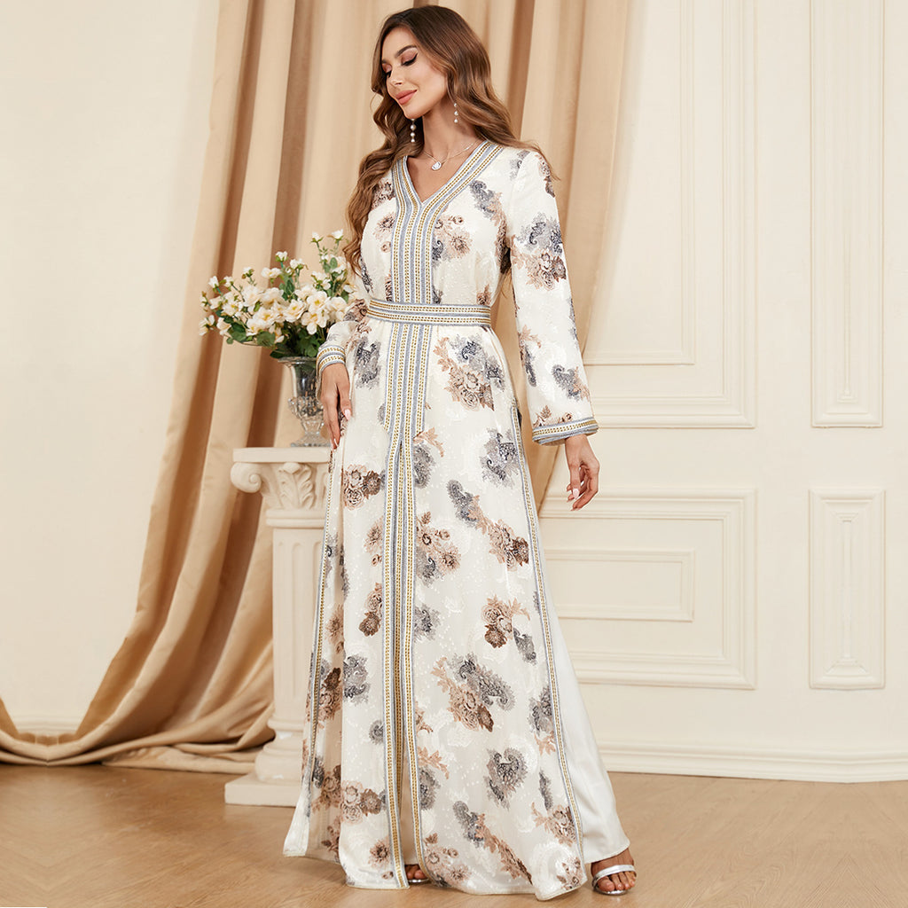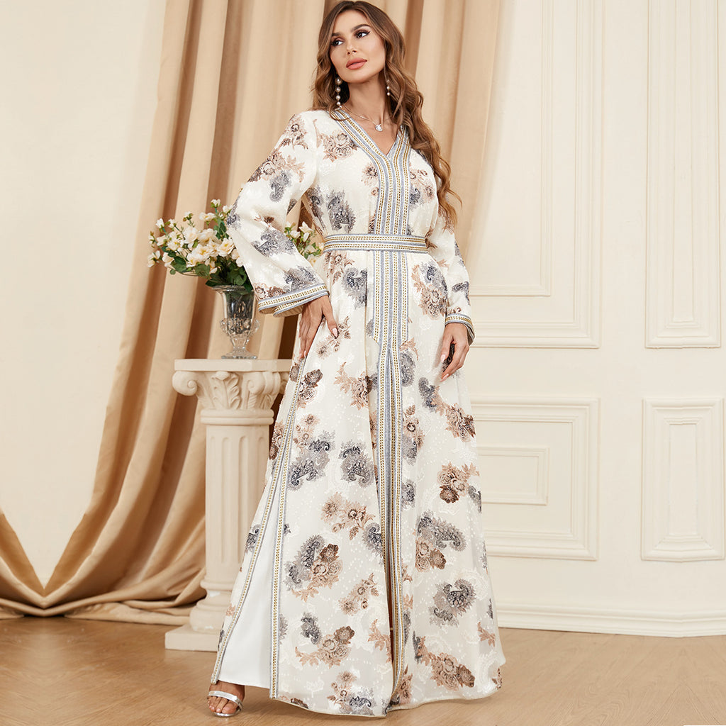 Ideaal voor zowel semi-casual als formele evenementen, deze dames met lange mouwbloemdruk witte maxi-jurk is een veelzijdige en flatterende keuze voor elk uitje.