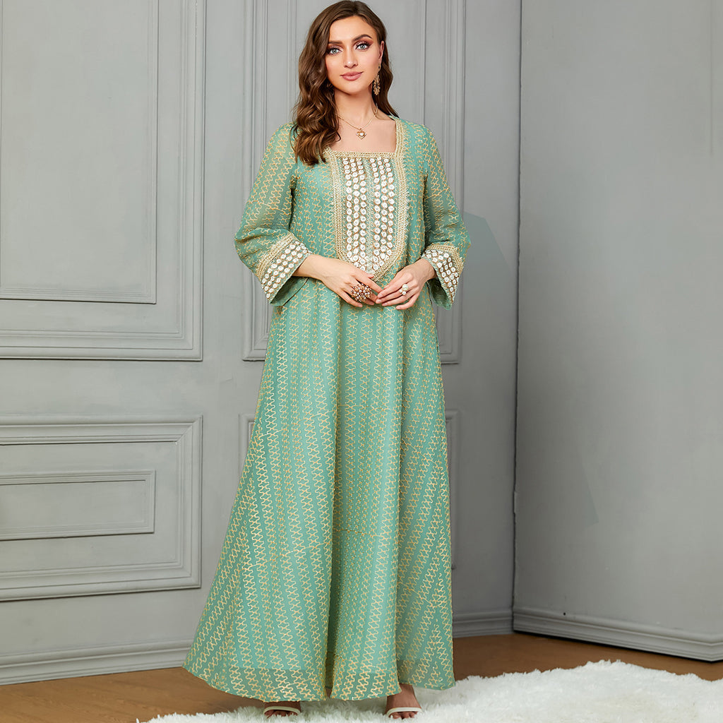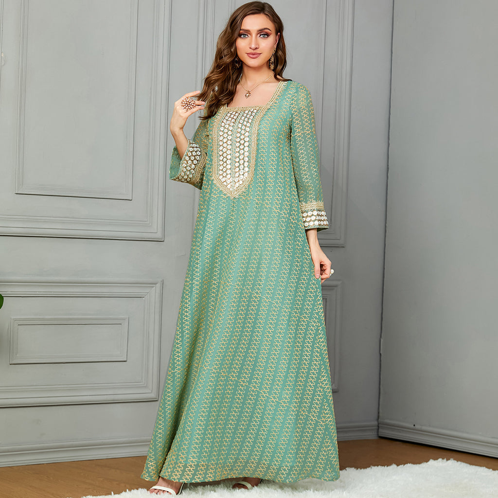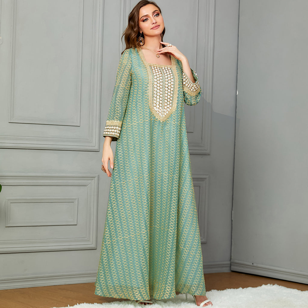 Jurk om indruk te maken in deze elegante maar subtiele groene maxi -jurk met lange mouwen met een witte en gouden details over de hele stof.