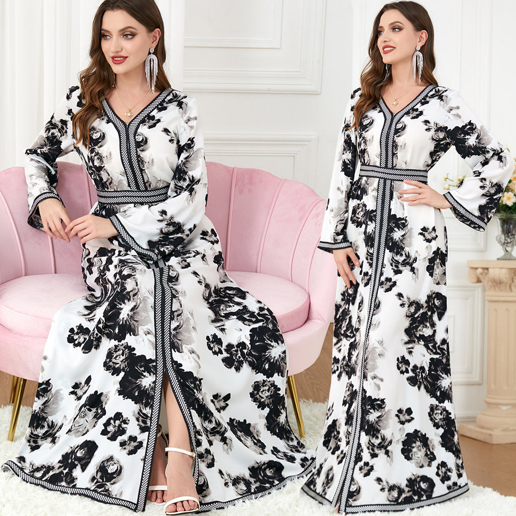 Houd het simpel en chic in de witte en zwarte bloemenmaxi -jurk met lange mouwen met de dames met zwart -wit geruite trim en een spleet aan de voorkant.