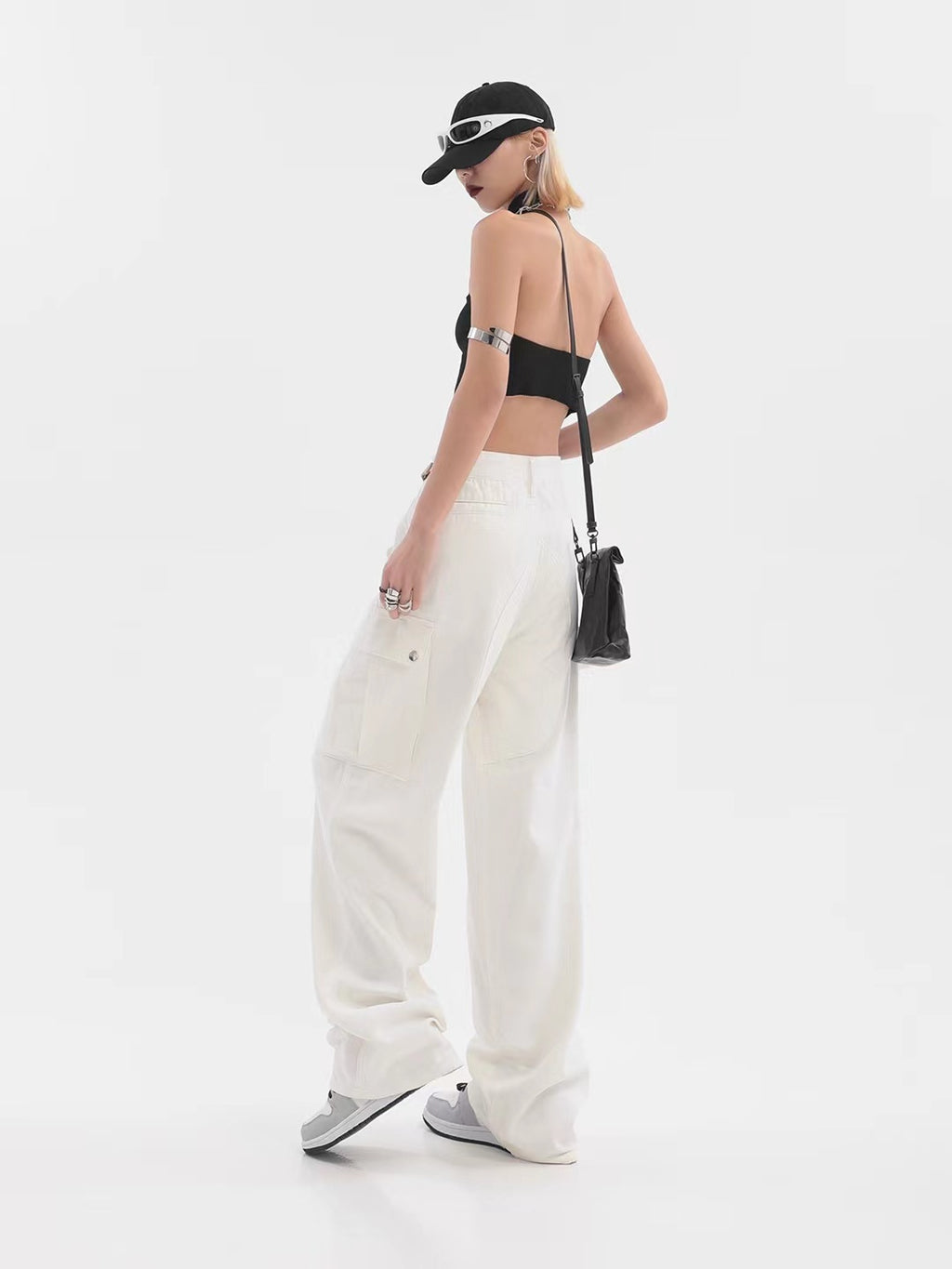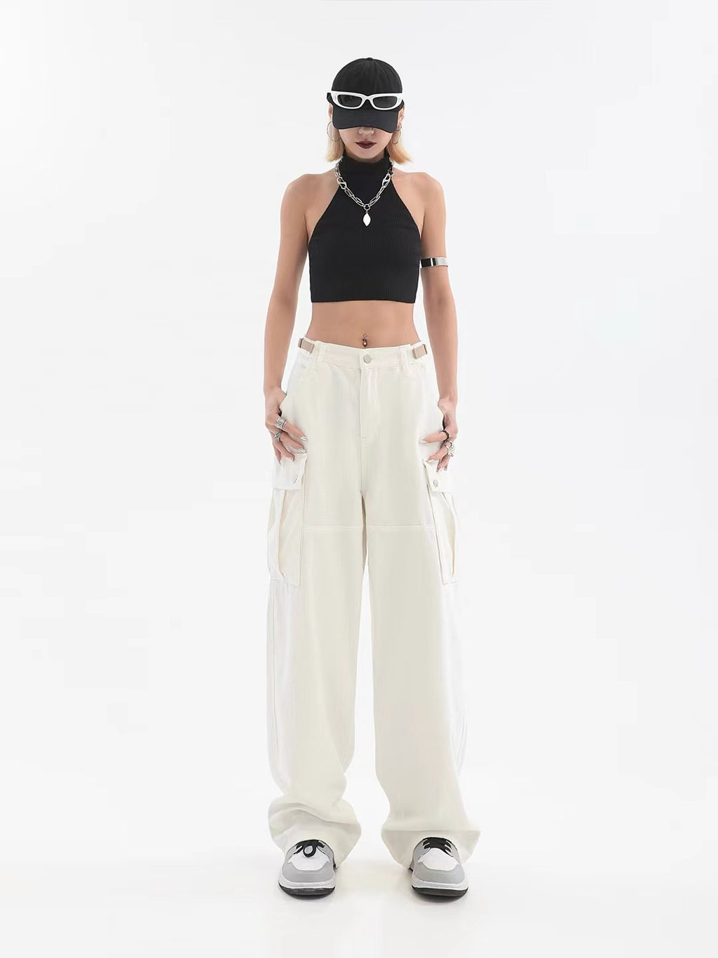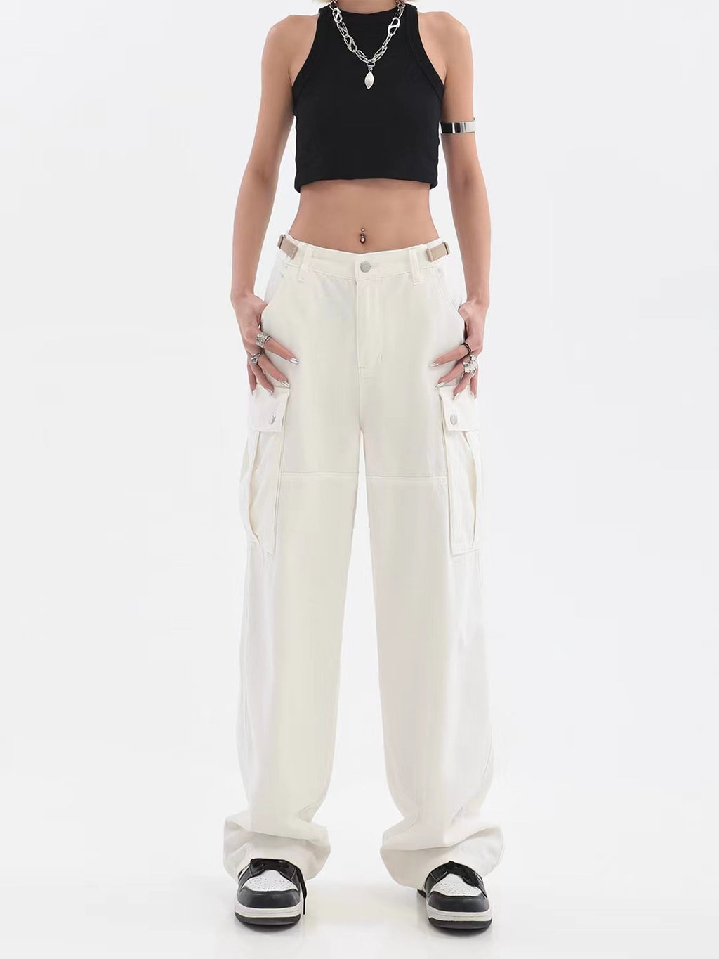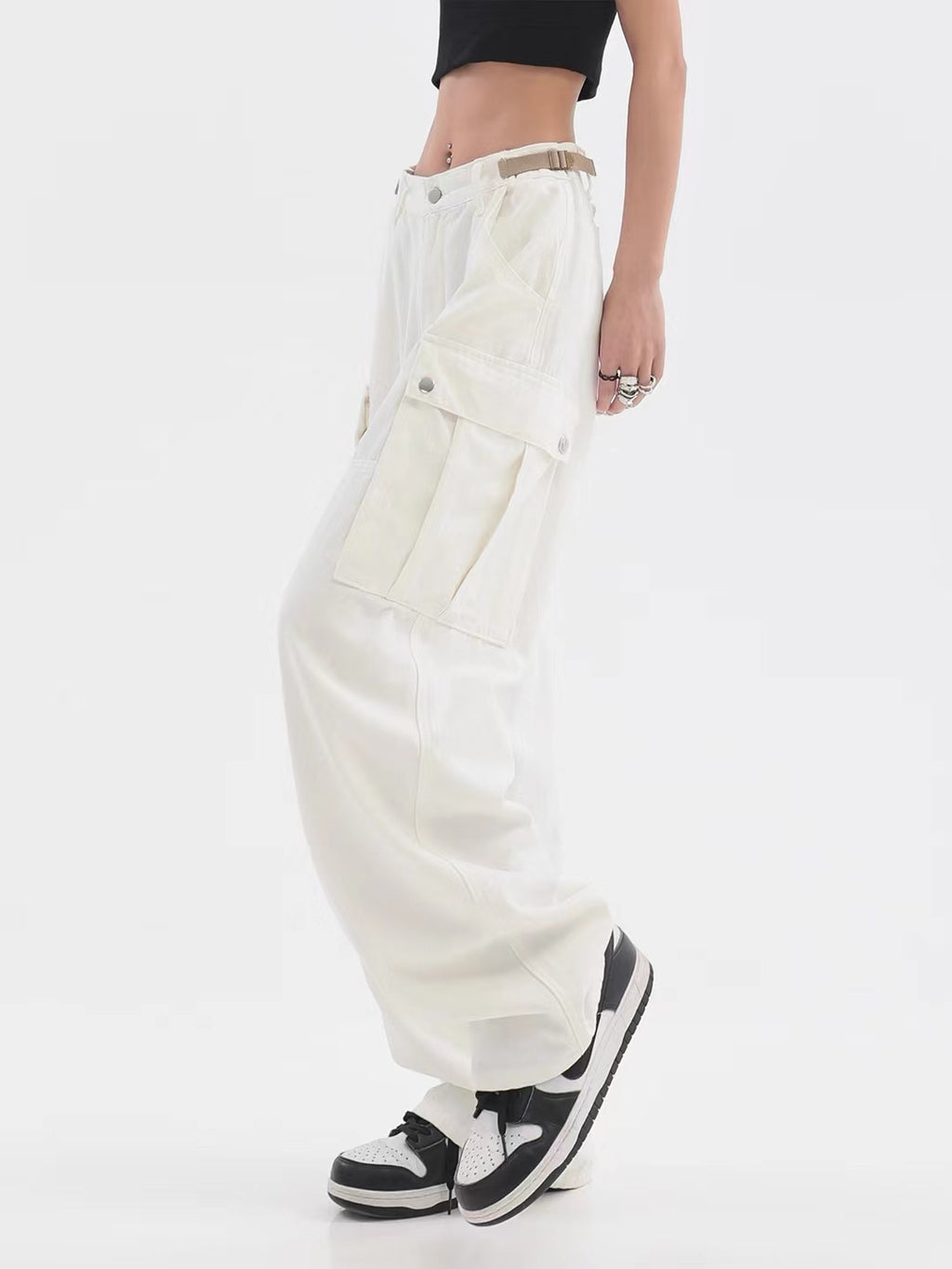 Krijg een schone en comfortabele uitstraling met de hoge taille -pootbroek van de vrouwen met zakken. Ze komen in een slanke, frisse witte tint met een bruine geaccentueerde riem.