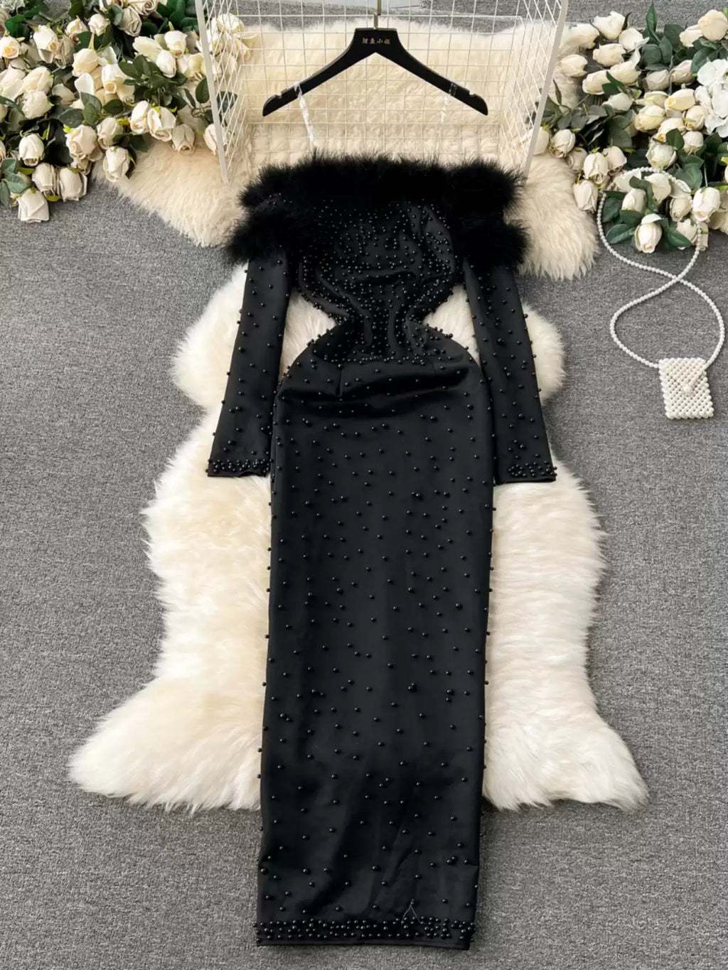 Feathery Top Long Form Fitting Maxi Dress