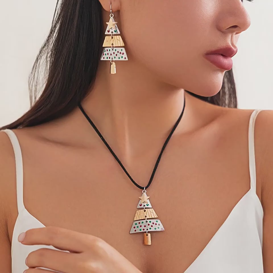 Elevate your holiday ensemble with this dazzling set featuring triple-tier Christmas tree dangle earrings paired with a matching pendant necklace. The intricate layered design captures the magic of the season and ensures a coordinated look. Perfect for transitioning seamlessly from daytime festivities to evening celebrations.
