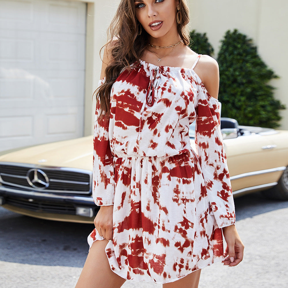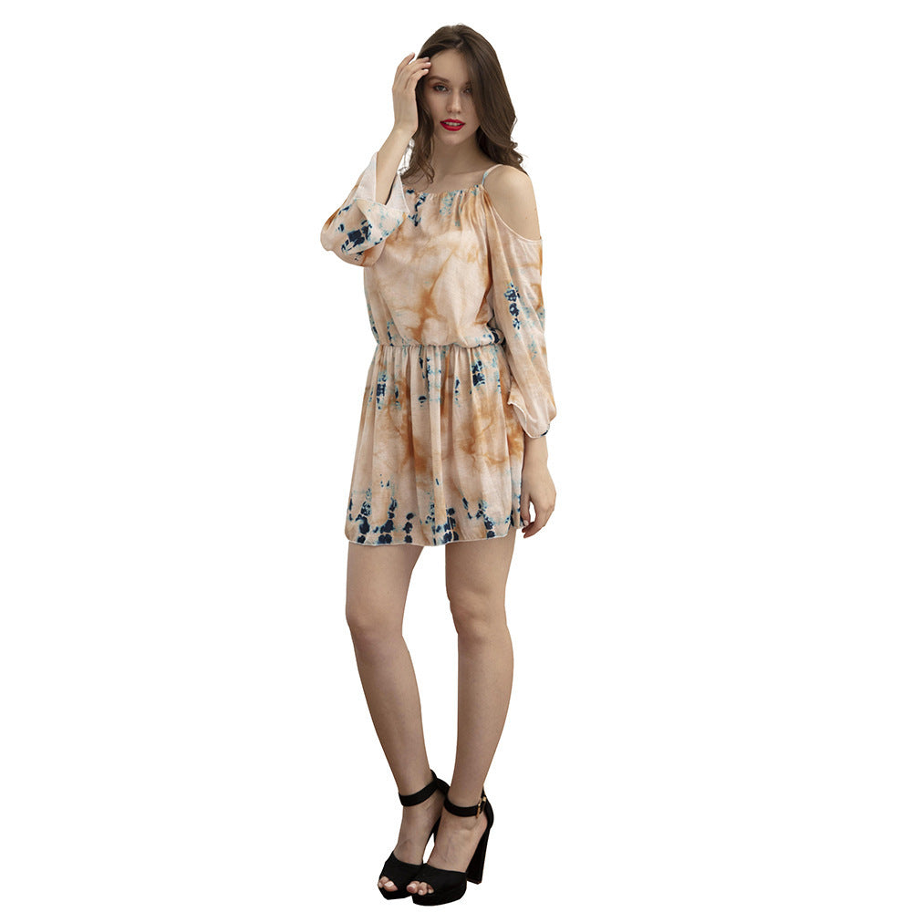 肩膀上的女士長袖迷你連衣裙,帶紮染色的印花
