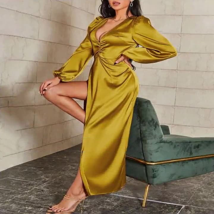 無論您在穿著女性絲滑的長袖低身連衣裙,帶有低切割V領的女性絲滑長袖連衣裙時,看起來都很誘人。它鬆散的袖子與V領搭配,使其看起來有些輕鬆而放鬆。