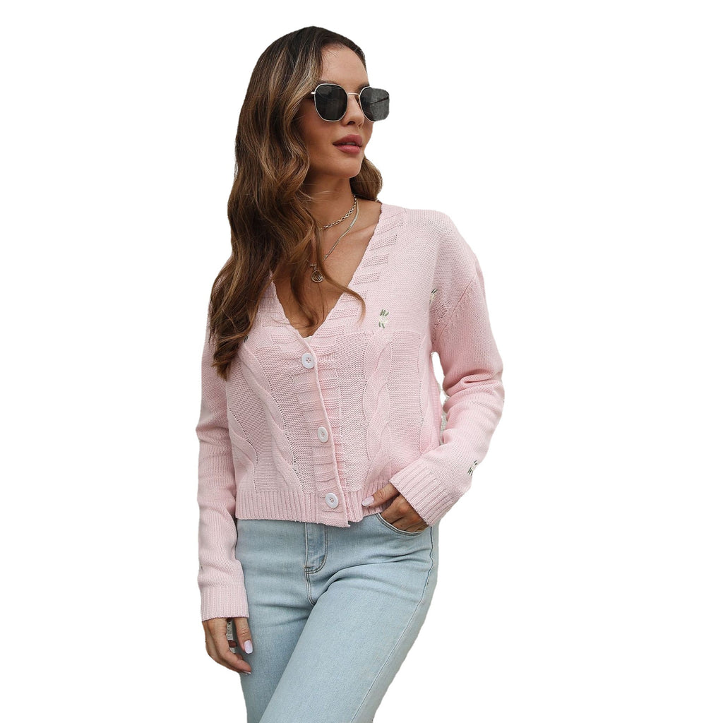 結束您的休閒秋季外觀,女子的V領長袖按鈕將毛衣上的毛衣與其他毛衣從其他毛衣中脫穎而出,這要歸功於三個按鈕將其閉合到前面。