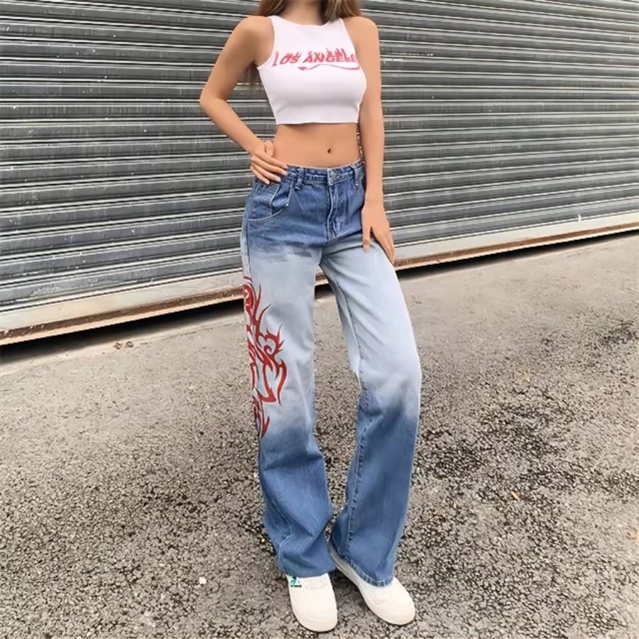 Stand out on the streets in the Women’s High Waist Denim Jeans with Red Patterning. An intricate red graphic is found on the side of one thigh to decorate the acid-washed denim.