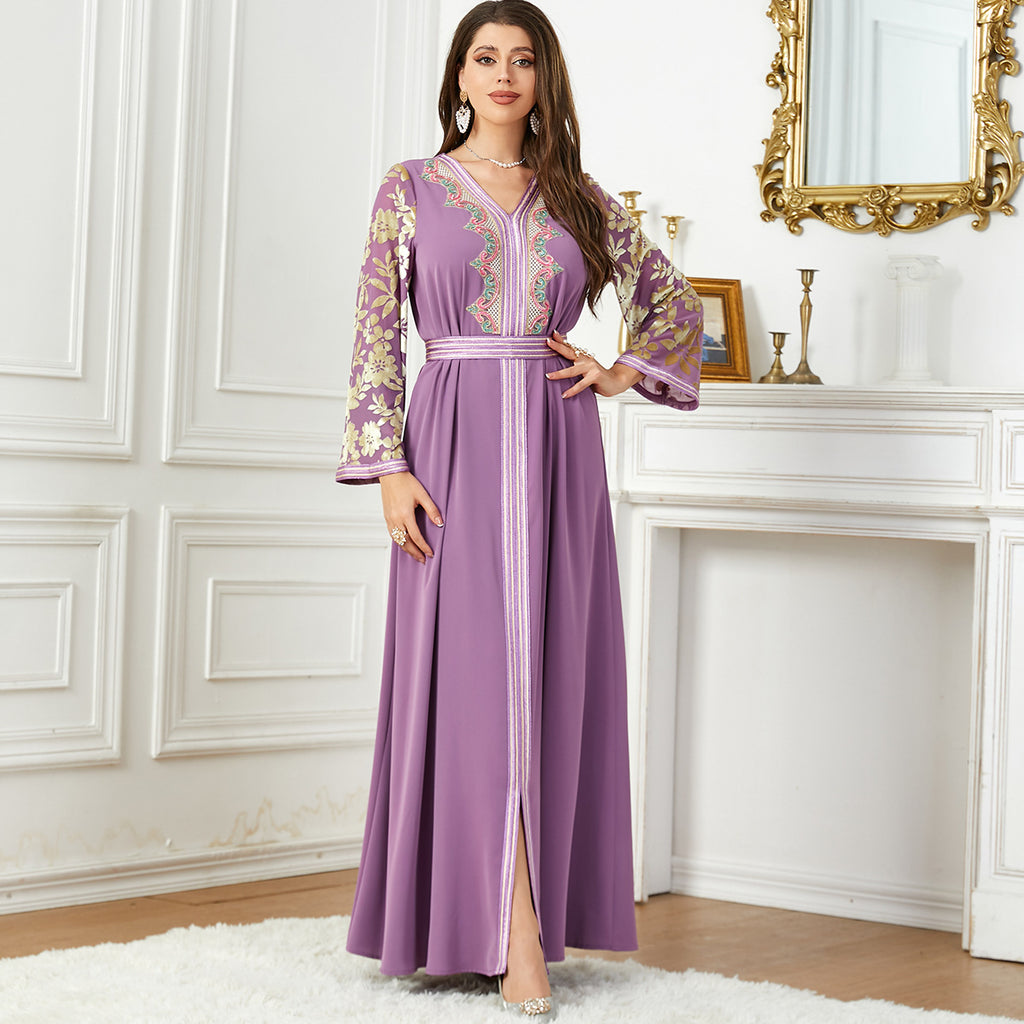 Stand out in any setting wearing the Women's Long Sleeve Maxi Dress with Floral Patterned Sleeves. This silky smooth dress comes in your choice of orange, purple or blue.