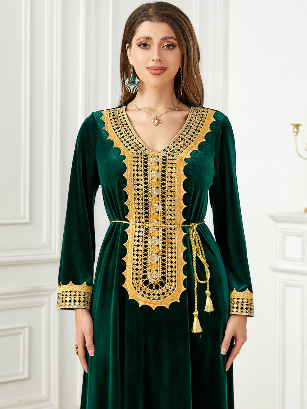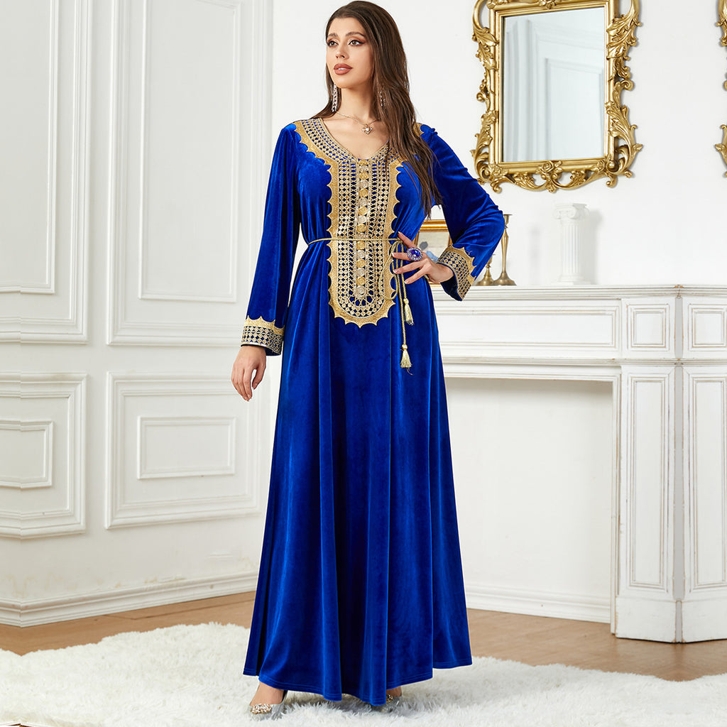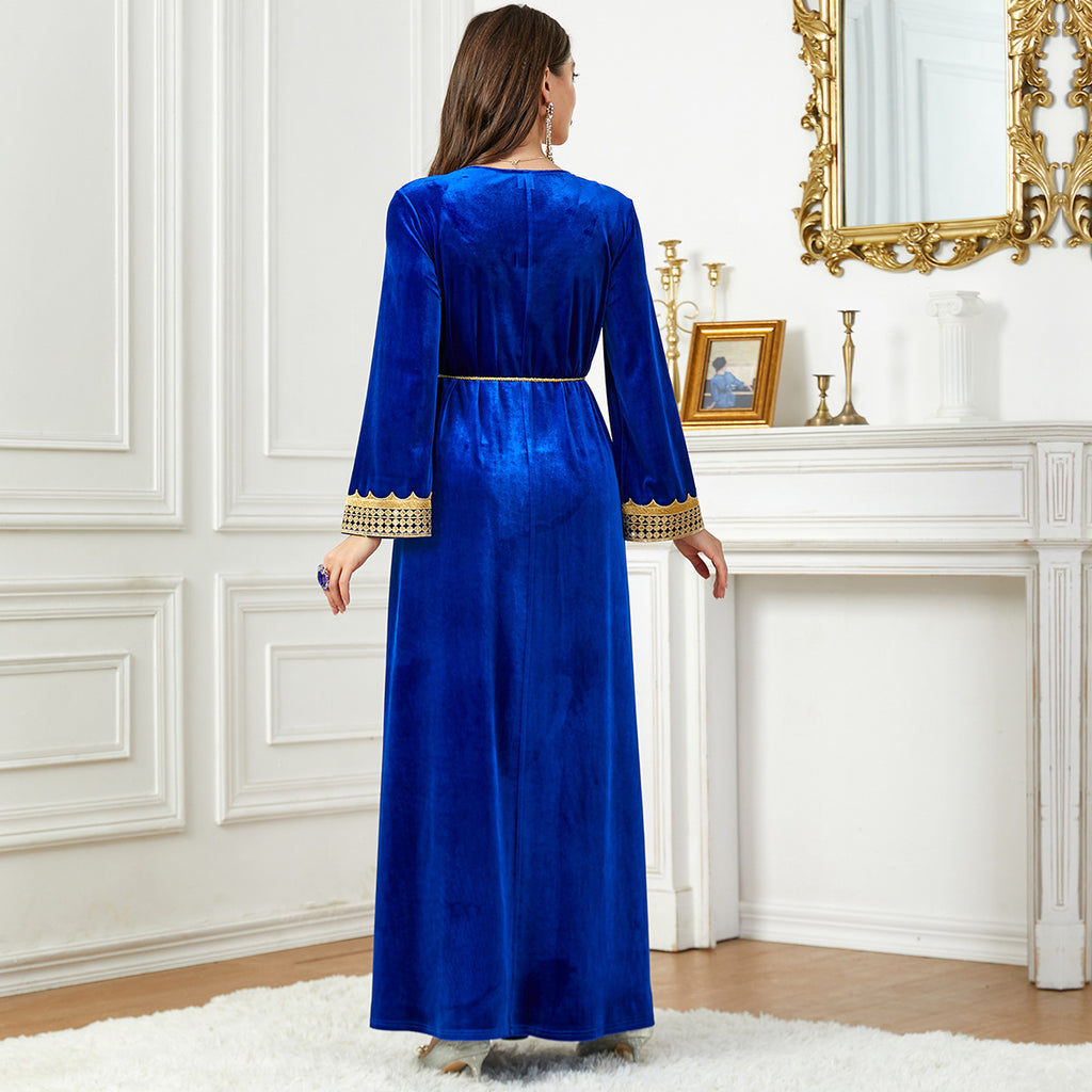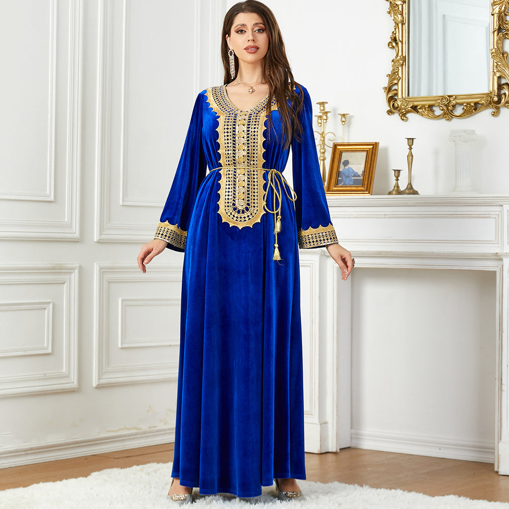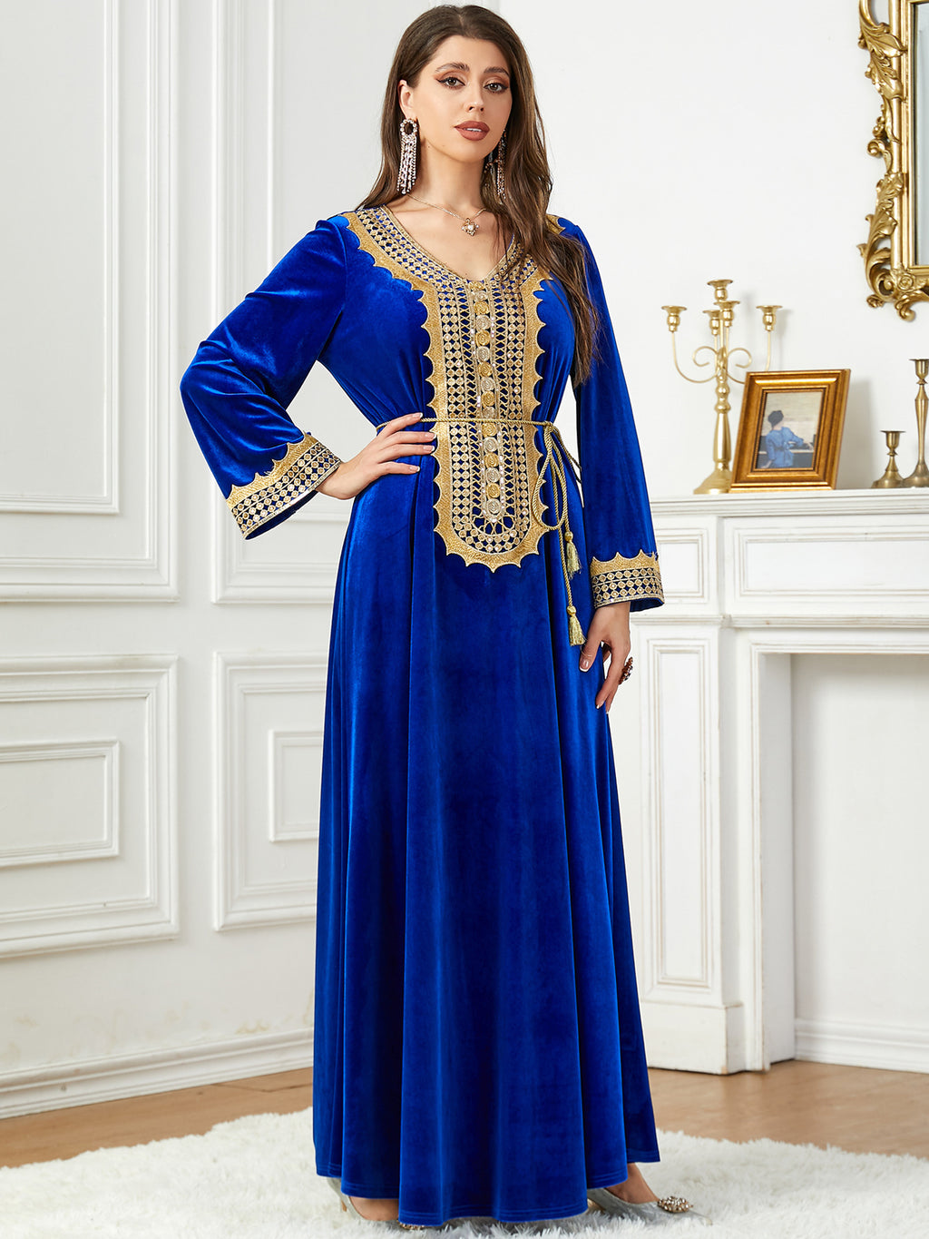 Look gorgeous at any event wearing the Women's Long Sleeve Maxi Dress with Tassel Belt. This rich blue dress features gold detailing along the bodice and the sleeves.