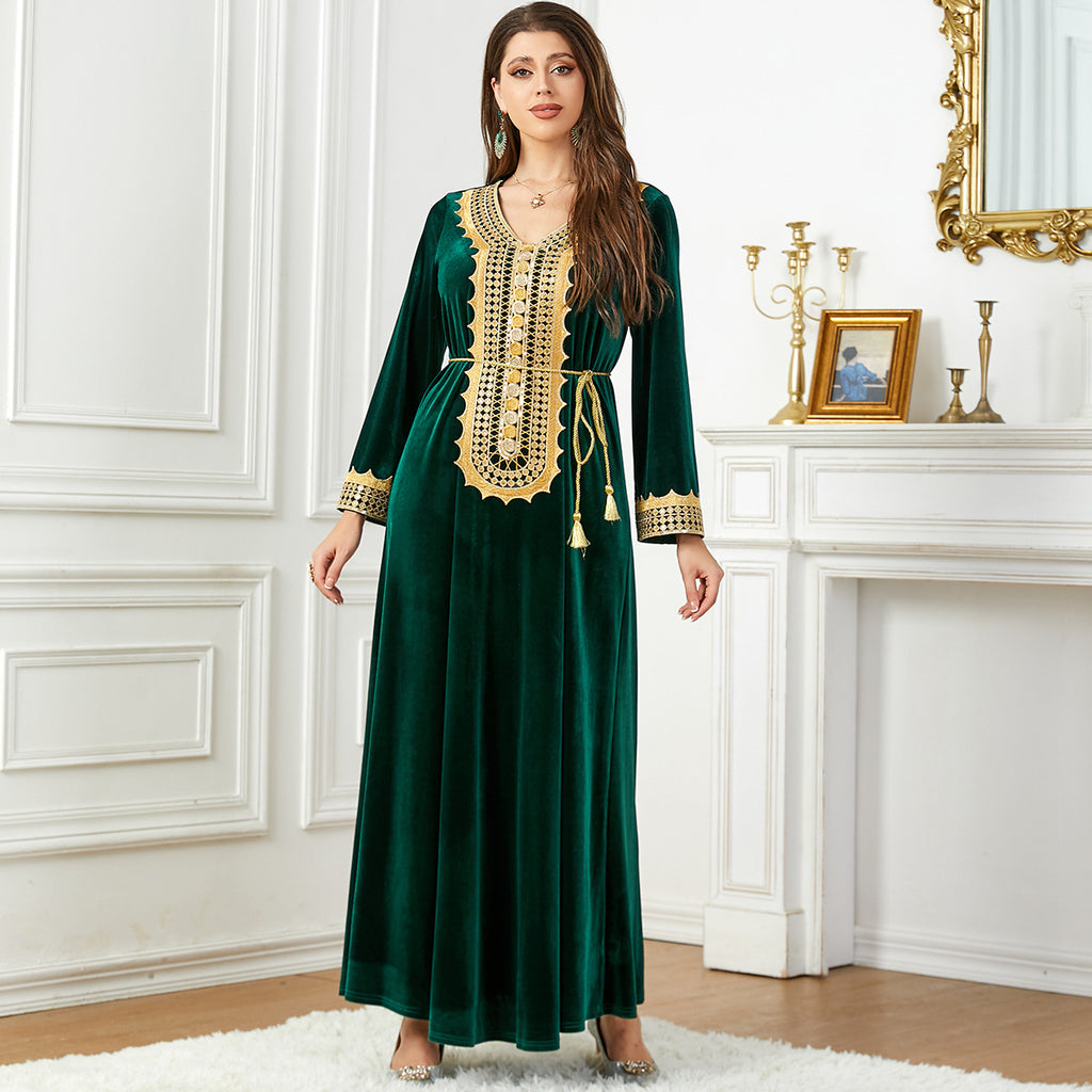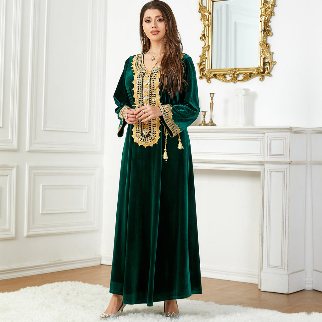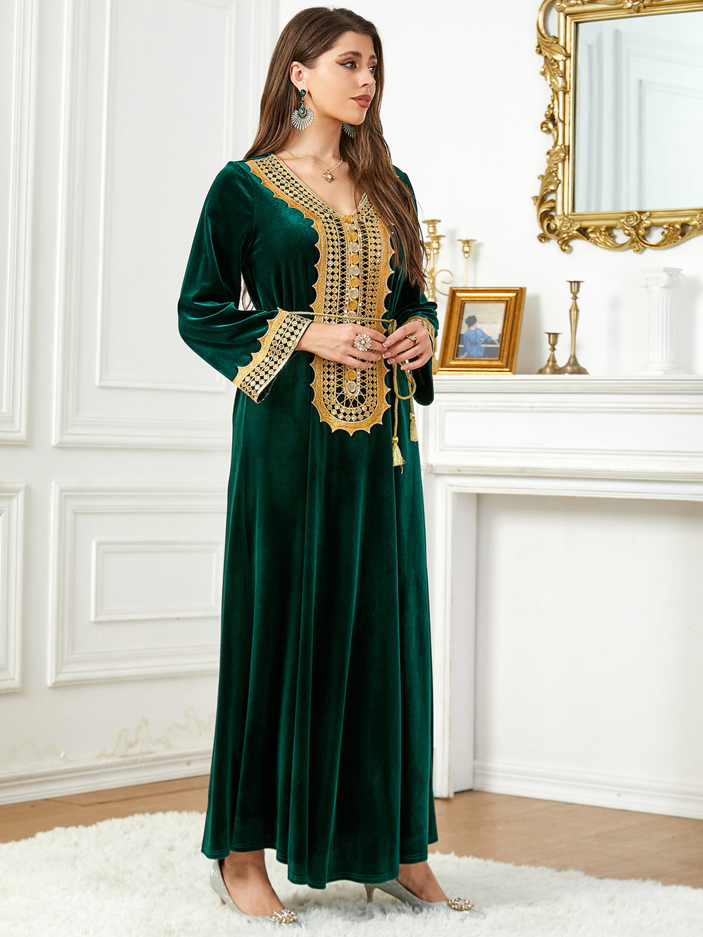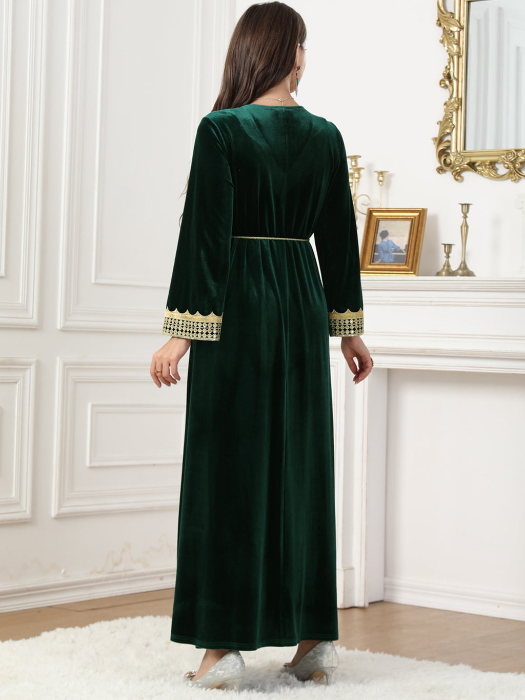 Look gorgeous at any event wearing the Women's Long Sleeve Maxi Dress with Tassel Belt. This rich blue dress features gold detailing along the bodice and the sleeves.